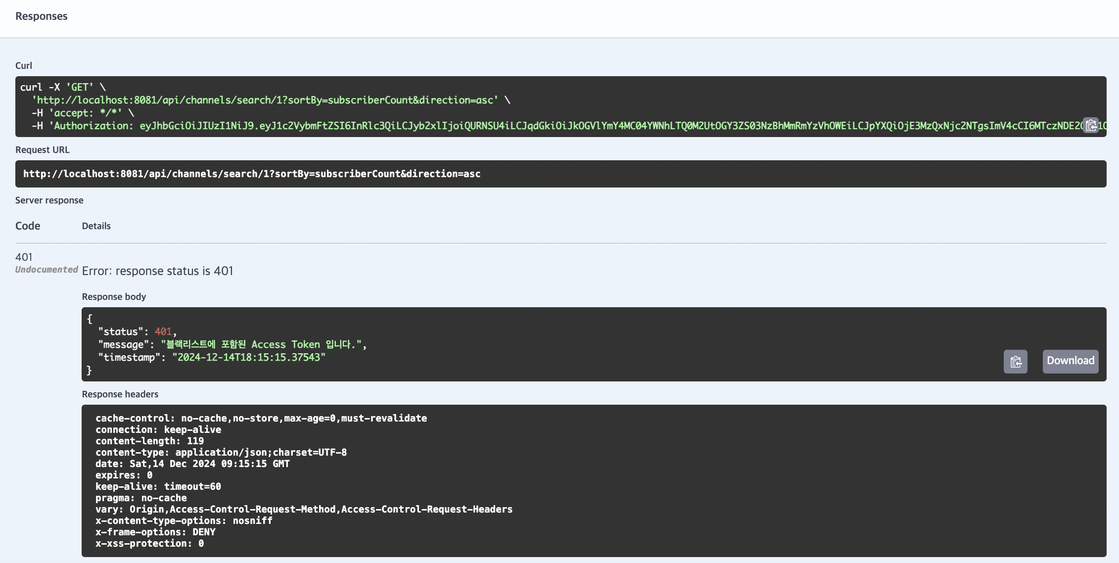 4번을 진행 후, Spring Security에서 JwtFilter에서 해당 토큰이 블랙리스트 토큰임을 예외를 발생하여 ExceptionHandler에서 처리한 응답 값을 반환할 것이라 생각했지만, AuthenticationEntryPoint에서 401 상태코드와 함께 "인증에 실패했습니다." 예외가 발생했다.